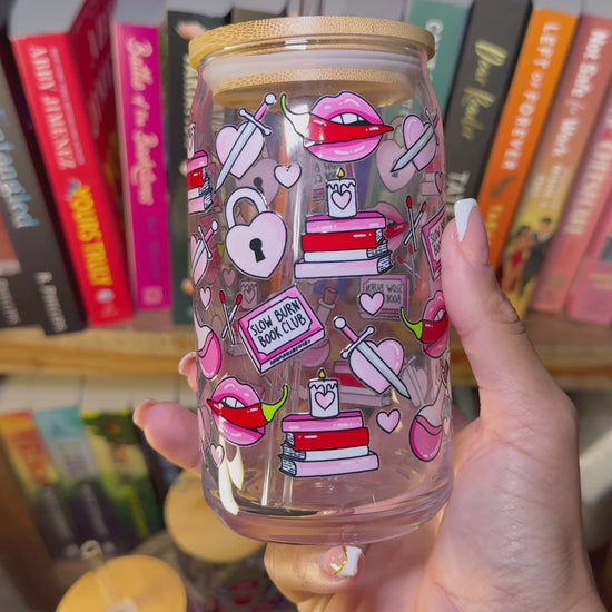 Slow Burn Bookish Glass Cup – 16oz Glass Can with Straw + Bamboo Lid | Romance Reader Gift